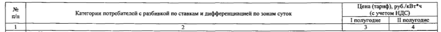 | Показатель (группы потребителей с разбивкой по ставкам и дифференциацией по зонам суток) | Цена в рублях за кВт*ч | |||||